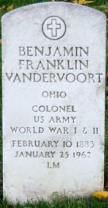 described Vandervoort as “one of the bravest and toughest battle commanders I ever knew”. At Goronne he was wounded by mortar fire, so was unable to take part in the divisions’ advance into Germany. He was promoted to colonel on 07-07-1946, and retired from the army on 31 August. After studying at Ohio State University he joined the Foreign Service in 1947. Benjamin Vandervoort died on the 22-11-1990 at the age of 73 years at a nursing home from the effects of a fall. He had two children with his wife Nedra; a son and a daughter. In the early 1990s, the United States Army Center for Leadership at Fort Leavenworth, Kansas, selected one or two colonels or lieutenant colonels from every American War from the Revolution through Vietnam. Colonel Vandervoort was selected as the outstanding ground battle commander for World War II. He is honored by a brief biography and several photographs in what is known as “Leadership Hallway” located on the second floor of Bell Hall. Vandervoort was portrayed by actor John Wayne