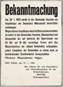 As a German retaliation measure, a total of 109 inhabitants of Haarlem were arrested on 01-02-1943, of whom 102 were taken as hostages to Kamp Vught and .on 02-02-1943 three Jews and seven communists were executed in the dunes near the Kopje van Bloemendaal. In the early morning of 22-01-1943, 10 men were arrested in Velsen. From the police file of 04-02-1943 signed by acting police commissioner in Velsen, H. Tuinstra, the 10 were arrested for communist activities at the request of Sicherheits Polizei and transferred to Amsterdam.
