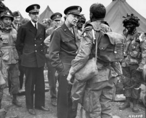 Major General Ray Barker standing to the left of General Dwight Eisenhower as he speaks to airborne troops, England, United Kingdom, 05-06-1944, the day before D-Day. On June 6, 1944, D-Day, a huge military operation, begins shortly after midnight. More than 5,000 ships transport 150,000 Allied soldiers and 1,500 tanks to the coast of Normandy in France.