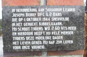 Translation: In memory of Squadron Leader Joseph Berry DFC & 2 Bars, who was killed in action on 1 October 1944 in the hamlet of Kibbelgaring. He shot down 60 VIs during WWII, saving many lives in those difficult times. He gave his life for our freedom.