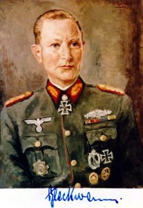 during World War II, who commanded several divisions. Bleckwenn grew up in the countryside of Osnabrück, joined on 16-04-1925 as a police officer in the police school Hildesheim, was appointed on 01-10-1925 Unterwachtmeister and transferred on 01-04-1926 to the Schutzpolizei, Protect Police, in Wesermünde. There he became on 01-01-1927 police sergeant and on 01-06-1930 Polizei-Oberwachtmeister. After attending the 14th officer candidate training course at the national police school for weapon service and body training in Spandau and the higher national police school in Potsdam-Eicke, he insisted on the officer examination in September 1930, was appointed on 11-08-1932 to the police officer candidate and from 20 September to 30 November 1932 he took part in a shooting instructor course and an armored vehicle training at the School of Technology and Transport in Berlin-Tempelhof. On 01-04-1933 he was promoted to police Leutnant and on 01-07-1934 the police Oberleutnant. On 01-10-1934, he joined as a MG officer in the staff of the National Police Group Hanover, where he served as a platoon commander in the 2nd Landes-Polizei-Hundertschaft in Hanover. He was activated in the Police Service on 16-04-1925, as a Police Candidate at the Hildesheim Police School. He was excepted in the Army Service on 01-08-1935, at the Infantry School in Döbritz. At the beginning of World War II, he was commander of the 127th Border Infantry Regiment. All the war fighting on the Eastern Front, he was in different Infantry Regiments. He led his regiment on a 44 day fighting retreat from the Dnieper to East Prussia. Generalmajor Bleckwenn was awarded the Oak Leaves At the request of SS Reichsführer Heinrich Himmler