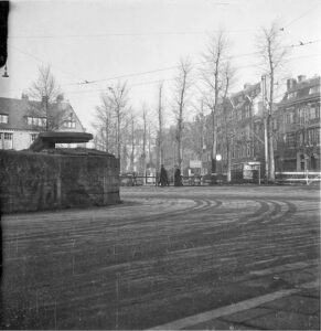 To defend these German institutions, concrete bunkers and barbed wire barriers were erected on Museumplein. This meant that the square became off-limits to ordinary Amsterdammers during the occupation. The second image shows a drawing of Museumplein from 1949. It shows that after the war, the bunkers and remnants of barbed wire were still present. It was not until 1953 that the bunkers on Museumplein were blown up and the square was redesigned. The photo of Museunplein shows a drawing of Museumplein from 1949. It shows that after the war, the bunkers and remnants of barbed wire were still present. It was not until 1953 that the bunkers on Museumplein were blown up and the square was redesigned.