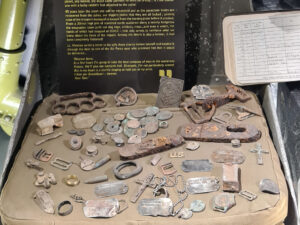 45 years after the crash the site was excavated, some of the artefacts from the excavation can now be seen on display at Dead Man’s Corner Museum including dog tags, rings and a watch which had stopped at the time of the crash, 01:12.