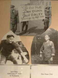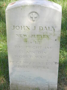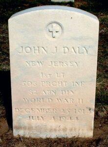 On the rainy morning of 04-07-1944 at the base of Hill 95 in Le Haye du Puits Lieutenant Daly led his men into a battle with the German where over 150 soldiers of the 508th including 5 officers were badly wounded or killed. John Daly was killed by enemy machine gun fire. At the time of his death, Lieutenant. Daly and his wife Doris, were expecting a child, John Jr..