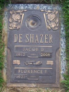 DeShazer, Jacob Daniel “Jake”, born 15-11-1912, into a family of wheat farmers in Salem, Marion County, Oregon, United States, to Jacob DeShazer (1873–1915) and his wife Hulda Marie, born Arensmeier Andrus (1883–1973).   The couple had one daughter and one son, Julia Marie DeShazer Griffith (1909–1988) and Glen Golden DeShazer (1914–1999) and four half sisters and two half brothers: Carrie May DeShazer Peik (1897–1988), Paul Joseph DeShazer Sr (1899–1986), Dorothy Jane DeShazer Fernald (1901–1977), Jennie Rachel DeShazer Grebe (1903–1987), Helen Amanda Andrus Hindman (1918–2010) and William Andrus (1923–1923). Jacob was married with Florence Fay, born Matheny DeShazer (1921–2017).