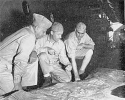 Major General Geiger (left), Colonel Silverthorn, and Brigadier General del Valle (right) examine a relief map of Guam on board the USS Appalachian