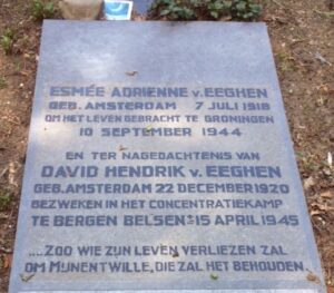 Esmée Adrienne van Eeghen is buried in Baarn. Her grave is also a memorial site for her brother David, who died in the Bergen-Belsen concentration camp. Her name and that of her brother David (‘Dave’) are listed on the Baarn War Memorial on Stationsplein.