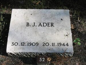 did succeed. After that, a gang of thugs operating from Stoop’s bath made two more attempts to capture Fake Krist, but they failed due to bad luck. Bastiaan Jan Ader also did a lot of resistance work outside his own municipality. When he was on his way in Haarlem on 22-07-1944, he was arrested and locked up in Haarlem and soon after transferred to the prison on the Weteringschans in Amsterdam. As a reprisal for an attack on a German soldier, he was executed at the age of 34 near Veenendaal and initially buried there. After the war, a white cross was placed at the execution site, which was renewed on the seventieth anniversary of the event. An annual commemoration takes place at Het Kruis op de Berg on 20 November. After the war, Ader’s remains were transferred to the Loenen Field of Honour.