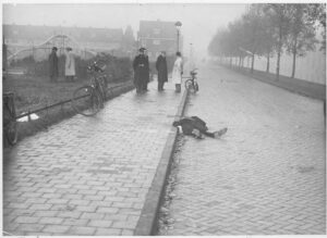 They went to the gym on the first floor and waited. In order to be able to shoot, they had broken a window. Completely unexpectedly, the school caretaker suddenly entered the room. He was tied up. Jan Overzet: “Just after half past eight, Krist arrived on his bike. He was in uniform and had a carbine on his back. (…). I gave Krijger a sign, because he didn’t know Krist. The distance between us and Krist was about 40, 50 metres.” Krijger took aim and probably shot four times. The first shot bounced off the Sint Bavo. Shards of stone injured the young Gerard Strik who had just come outside. The other shots ended Krist’s life. His guard was unable to do anything. The resistance fighters managed to escape before the Germans cordoned off the area.