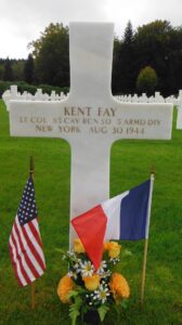 Commander of the 85th Cavalry Reconnaissance Squadron of the 5th Armored Division, Lieutenant Colonel Kent Fay was killed in action at Rully, France, on 30-08-1944, leaving behind a wife and three young children. Kent had been in an armored car 50 miles outside of Paris leading reconnaissance troops on a drive to the Belgian border when they met German rear guard infantry troops and antitank guns. The first shot was deatly for Kent.