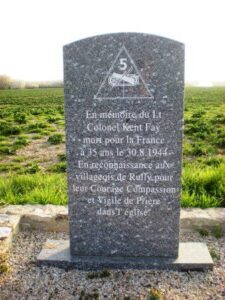 The monument honors Lieutenant Colonel Kent Fay, Commander of the 85th Cavalry Reconnaissance Squadron, 5th Armored “Victory” Division, who was killed at the age of 35 outside this village.