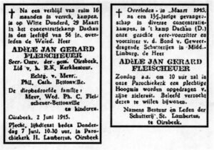 The ten arrested Jews have never been heard of again. Two days after his arrest on 8-11-1943, the NSB mayor of Oirsbeek Willem Henkens (from The Hague) had the NSB commissioner of the Province of Limburg, Count Max. de Marchant et d’Ansembourg from Amstenrade, know by letter that Gerard Fleischeuer had been arrested in the evenings of 16-11-1943. Gerard was deported to the infamous prison in Scheveningen (Oranje Hotel).