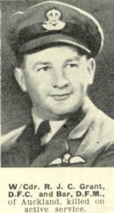 Grant, Reginald Joseph Cowan “Reg”, born 03-06-1914 Woodville, Tararua District, Manawatū-Whanganui, New Zealand, the son of William Edward and Gertrude IsabellaGrant, born Rowntree. Before the war, Reggie Grant was a metal spinner at Aluminium Utensils Ltd, Auckland. His father, W. E. Grant, owned the Ponsonby Club Hotel in Auckland. He was educated at Mount Albert Grammar School and after completing his schooling, he commenced working as a metal spinner. Reginald joined the RNZAF, Royal New Zealand Air Force, in November 1939 and after receiving his wings, he was posted to No, 145 Squadron as a Sergeant-Pilot, under command of Squadron Leader Lance Cleo “Wildcat” Wade. Reginald later transferred to No. 485 Squadron, which he would eventually command for a period. After a rest off operations, he returned to duty in November 1943 as commander of No. 65 Squadron. In January 1944, he was promoted to wing commander and appointed wing leader of No. 122 Wing..arge