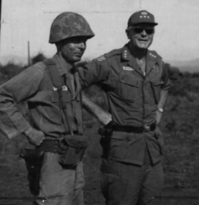 Heintges (right) talks to Major Paul Lenhart, XO, 2nd Battalion, 9th Artillery, 3rd Brigade, 25th Infantry Division, 24-12-1965