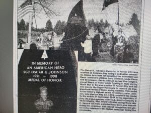 from Mount Vernon, Ohio in rendering aid. That night he secured their removal to the rear and remained on watch until his company was relieved. Five companies of a German paratroop regiment had been repeatedly committed to the attack on Company B without success. Twenty dead Germans were found in front of his position. By his heroic stand and utter disregard for personal safety, Sergeant. Johnson was in a large measure responsible for defeating the enemy’s attempts to turn the exposed left flank.