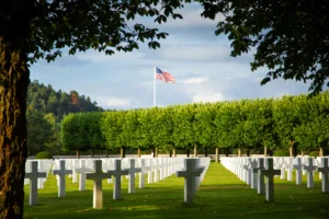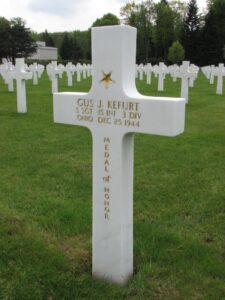 citation reads: “He distinguished himself by conspicuous gallantry and intrepidity above and beyond the call of duty on 23 and 24 December 1944, near Bennwihr, France. Early  in the attack Staff Sergeant Kefurt jumped through an opening in a wall to be confronted by about 15 Germans. Although outnumbered he opened fire, killing 10 and capturing the others. During a seesaw battle which developed he effectively adjusted artillery fire on an enemy tank close to his position although exposed to small arms fire. When night fell he maintained a 3-man outpost in the center of the town in the middle of the German positions and successfully fought off several hostile patrols attempting to penetrate our lines. Assuming command of his platoon the following morning he led it in hand-to-hand fighting through the town until blocked by a tank. Using rifle grenades he forced surrender of its crew and some supporting infantry. He then continued his attack from house to house against heavy machinegun and rifle fire. Advancing against a strongpoint that was holding up the company, his platoon was subjected to a strong counterattack and infiltration to its rear. Suffering heavy casualties in their exposed position the men remained there due to S/Sgt. Kefurt’s personal example of bravery, determination and leadership. He constantly exposed himself to fire by going from man to man to direct fire. During this time he killed approximately 15 of the enemy at close range. Although severely wounded in the leg he refused first aid and immediately resumed fighting. When the forces to his rear were pushed back 3 hours later, Gus refused to be evacuated, but, during several more counterattacks moved painfully about under intense small arms and mortar fire, stiffening the resistance of his platoon by encouraging individual men and by his own fire until he was killed. As a result of Staff Sergeant Kefurt’s gallantry the position was maintained.”