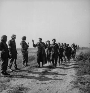 Members of the Luftwaffe taken prisoner by the 8th Canadian Infantry Brigade during an attack on a factory in Ranville, 1944.