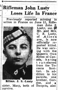 Rifleman Lusty landed on Juno Beach with D Company on D-Day, 6 June 1944. He was initially reported missing but later confirmed killed in action during the battle for Le Mesnil Patry,