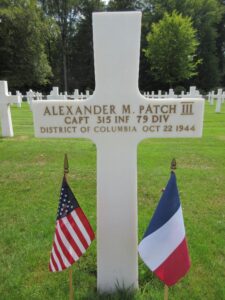 Captain Alexander McCarrell Patch III is buried at the Epinal American Cemetery and Memorial in Epinal, Departement des Vosges, Lorraine, France, in Plot A, Row 9, Grave 63.