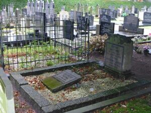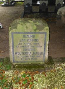 in 1942. The book was set in prehistoric times. In 1950, Popping was released, likely for health reasons. His family had previously submitted a request for clemency because Popping was suffering from leukemia. On June 26th, he returned to Oosterwolde, where he died on 10-08-1950, age 65. Hendrik Jan Popping was buried in the Oosterwolde cemetery, next to his parents’ grave. In 1956, his wife Johanna Wouterina Jansen, whom he had married in 1909, passed away. The couple had one daughter, Elisabeth, born in 1911, who was also buried in her parents’ grave after her death in 1996.