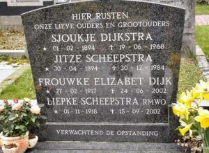 Liepke “Bob” Scheepstra passed away in Amersfoort on 15-9-2002, age 83 and was buried on Schiermonnikoog at the Municipal Cemetery.