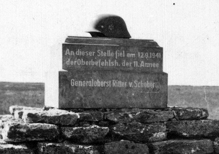 The little remains were taken to Nikolajew and buried near the monument for fallen soldiers from the Krim war 1853/56 in Bug Liman near Nikolajew, now Ukraine. The commander-in-chief of the army, Field Marshal Walter von Brauchitsch, the state leader and Marshal of Romania, Ion Antonescu and the eldest son of the fallen Generaloberst, Unterofficer Schobert, also took part in the mourning patron. Von Schobert was succeeded by Generalfeldmarschall der Infanterie, Erich von Manstein