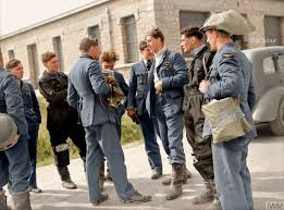 The Commanding Officer of No. 73 Squadron RAF, Squadron Leader J W C “Hank” More (back to camera) having just landed, confers with his pilots outside the Squadron’s Operations Building at Reims-Champagne after a series of dogfights with German aircraft. Facing More, in the white roll neck jumper, is Flying Officer Edgar James “Cobber” Kain. DFC