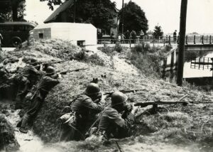 In a boat, with a light and a heavy machine gun, they cross the canal and advance on the other side to the bridge keeper’s house. One shelter after another is taken, driving the Germans away with hand grenades and pistol fire. While the light machine gun is left at the house to provide covering fire, the lieutenants advance with two soldiers, dragging the heavy machine gun along. This is set up in a pit a little further on. As soon as the soldier wants to open fire with it, Jan is hit in the shoulder. Jan takes his place, but is immediately hit in the head and dies a few moments later. Gastman sees that the post is untenable and is forced to retreat with the remaining corporal.