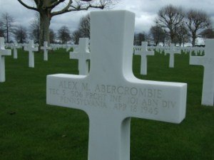 discovers what probably happened.“When the group returned later that day, they brought back four – not three – bodies from the common grave in which they had been buried by some Polish workers (all the Germans had been pulled out of the area). Abercrombie, while on his way to the boats, had apparently passed out, bled to death, and was buried with the others. The 101st Airborne Division