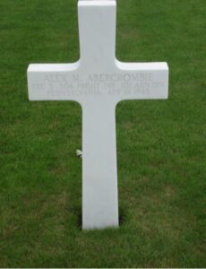 in World War II’ ”Tec 5 Alexander Miller Abercrombie died 12-04-1945, at the age of 23, not far from Himmelgeist, a small town just south of the city Düsseldorf, which is part of Landkreis Düsseldorf, Nordrhein-Westfalen, Germany. Alex is buried at the Netherlands American Cemetery and Memorial in Margraten.Tec5 Alexander Miller Abercrombie was awarded a Purple Heart,