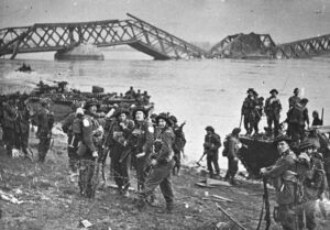 During a barrage in the fields, Private Ralph Elkins was wounded and a medic took care of his wounds. “When the medic finished working on Elkins, we moved over to the ditch and found that the other medic, Alex Abercrombie, was also a casualty. Although up and about, he was bleeding from a temple wound, where a shell fragment had pierced the side of his helmet. After being bandaged, he was sent on ahead to where we were to meet the boats.”But when the rest of the patrol later assembles at the location of the boats on the shore of the Rhine River,